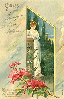 GRUSS AUS: SEM FRONTEIRAS Lá pelos idos de 1890, os chamados cartões pioneiros deram lugar aos belíssimos cartões Gruss Aus, que nesta época eram impressos em uma única cor. Somente em 1895 é que apareceram os Gruss Aus coloridos, estampando, geralmente, os lugares mais importantes das cidades de então, entre eles as estações de trem, os castelos, as igrejas, as escolas, as praças etc. São, acima de tudo, cartões litográficos e topográficos. Entretanto, os mais lindos Gruss Aus são aqueles que retratam algum detalhe destas cidades, como seus brazões, seus bondes antigos e até as estátuas e as casas de seus heróis nacionais. Quase todos com muitas flores, bom gosto e estilo art noveau. |