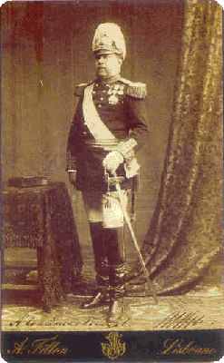 Retrato de corpo inteiro, fardado, com a cabeça coberta,