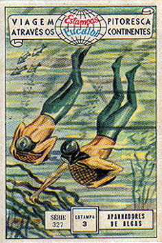 APANHADORES DE ALGAS É uma indústria a pesca das algas; mergulhadores, muitas vezes mulheres, estão encarregados dessa árdua tarefa. Certas espécies de algas são comestíveis e saborosas, e portanto muito apreciadas na preparação da comida; outras espécies servem de matéria prima para produtos químicos e farmacêuticos. O Japão, apesar de alguns métodos conservativos, é um país moderno, onde existem fábricas e escolas. COLLECTORS OF ALGAE It