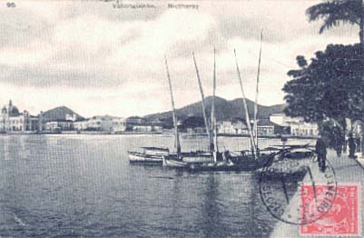 ![]() 11 - A ilha e o bairro da Boa Viagem foi um local muito apreciado e retratado por turistas e viajantes . Bairro preferido por estrangeiros e artistas que residiam em Niterói, foi o local da primeira escola de pintura ao ar livre. Em remoto passado, a ilha que denomina o bairro possuía um pequeno fortim colonial para ajudar na defesa da baia da Guanabara. Neste cartão os alunos do famoso colégio niteroiense, dirigido por padres salesianos, excurcionam naquele bucólico sitio. (RMM) ![]() 12 - O atual centro da cidade (década de 1920), mostrando alguns barcos e faluas que faziam o transporte de mercadorias e passa-geiros para o Rio de Janeiro. Vê-se ainda os prédios da Catedral de São João Batista ( padroeiro da cidade), a Estação Hidroviaria, des-truída pelos populares insatisfeitos com a qualidade dos transportes nos fins da década de 1950. Vê-se ainda o local onde depois foi construída a imponente sede central dos Correios e Telegraphos, testemunho dos bons tempos em que a cidade foi a capital fluminense. (brasilcult) |