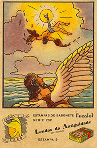 DEDALO E ICARO Esquecido das recomendações do pai, Ícaro, seduzido pelo prazer do vôo, aproximou-se demasiado do sol. As asas amoleceram com o calor e terminaram por se desfazer, indo o moço cair no mar que, em sua memória, se chamou Icário. Dédalo, mais prudente, nada sofreu e prosseguiu viagem, indo ter às terras do Rei Cócalos. |