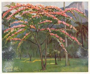 (Leg. Caes.) Observações: Grandemente ornamental, ostentando, como a Cássia grandis, flores côr-de-rosa dispostas nos ramos longos e flexíveis, recomenda-se não só para embelezamento de parques e jardins, como para centro de canteiros em largas avenidas. A copa esgalhada, o que faz ressaltar a pujança das flores. Pode ser empregada como decoração complementar entre arvores de grande porte, evitando sombra em excesso que lhe prejudicaria a forma natural. Floração: Floresce nos meses de Dezembro e Janeiro. Brasil. |