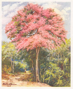 CRISPIFLORA, H. B. K. Nomes vulgares: "BARRIGUDA", "PAINEIRA" Árvore freqüente nas zonas próximas ao litoral; floresce inteiramente despida de folhas; as flores são grandes e róseas, sendo por isso de belo efeito quando cobrem a árvore nos meses de fevereiro e março. Tree frequently found in the coastal areas; it loses its leaves at flowering season. Its large pink flowers make it a very showy tree. Flowers in February-March. |