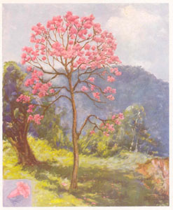 GRANULOSA, Cogn. Nomes vulgares: "QUARESMEIRA ROXA", "FLOR DA QUARESMA" Observações: freqüente no Rio de Janeiro, São Paulo, Minas Gerais, Bahia, Pará, etc. Muito ornamental. Própria para jardins. Árvore de pouco desenvolvimento, mas de rápido crescimento. Floração: na família das Melastomatáceas estão inclusos numerosos vegetais, que, notadamente no primeiro trimestre do ano, com as suas belas flores – do branco até o roxo escuro – enfeitam os nossos prados e montes. O gênero TIBOUCHINA é o mais comum. In the family of Melastomataceae, there are included numerous genera and species which embellish our plains and hills with their beautiful flowers from white to dark violet – mainly during the first quarter of the year. |