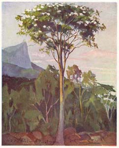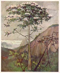(Leg. Caes.) Nome vulgar: “PACOVA DE MACACO” Observações: Bôa apresentação ornamental, sendo dotada de ampla e bem formada cópa. É comum nas encostas da Serra do Mar e de grande desenvolvimento na flora do Distrito Federal. Recomenda-se para parques, jardins e avenidas. Floração: Possue flôres alvas e brilhantes. Floresce nos meses de Novembro a Janeiro. Ample and well shaped crown, which makes this tree very ornamental. Very common in the “Serra do Mar”; it is also found in the woods of the Federal District. Suitable to parks, gardens, and avenues. Its flowers are snowy, and brilliant; the tree blossoms from November to January. |