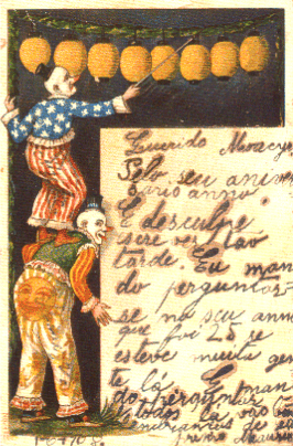 DO CIRCO Coleção e texto: Marília Carqueja Vieira ![]() A palavra Circo tem origem na forma circular dos picadeiros do Coliseu Romano. A única coisa que guardou do antigo circo romano foi a arena outrora ensangüentada - hoje, alegre picadeiro, onde com vistosas roupas se apresentam: domadores, palhaços, trapezistas. Motivo de inspiração para músicos e escritores, serviu de tema a Leoncavallo para sua ópera "I Pagliacci". (Mar) |