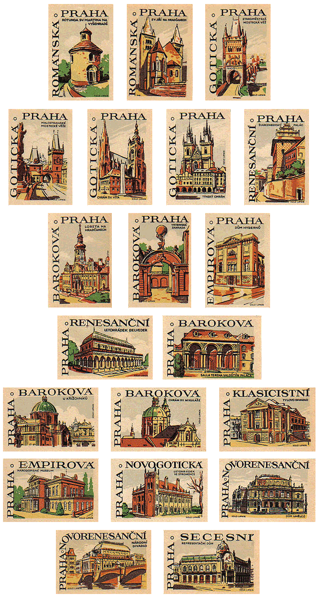 Praga é uma das cidades mais visitadas do mundo, mas quem entra lá geralmente não sabe diferenciar o estilo arquitetônico dos seus monumentos. Mas as etiquetas de caixas de fósforos sabem, como pode ser visto nesta série de monumentos, entre outros góticos, barrocos etc. A natureza fez do Rio de Janeiro o lugar mais lindo do mundo, mas foi a alma humana que transformou Praga numa belíssima cidade histórica e cultural.