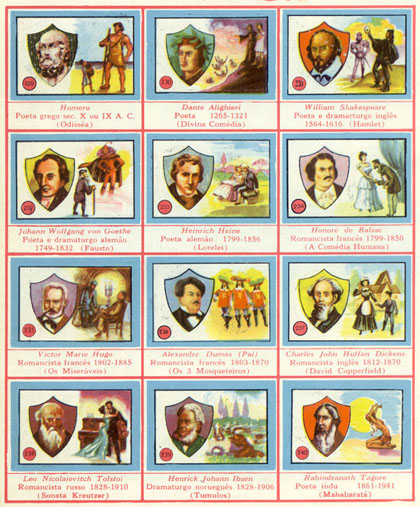 229 - Homero - Poeta grego sec. X ou IX A.C. (Odisséia) 230 - Dante Alighieri - Poeta 1265-1321 (Divina Comédia) 231 - William Shakespeare - Poeta e dramaturgo inglês 1564-1616 (Hamlet) 232 - Johann Wolfgang von Goethe - Poeta e dramaturgo alemão 1749-1832 (Fausto) 233 - Heinrich Heine - Poeta alemão 1799-1856 (Lorelei) 234 - Honoré de Balzac - Romancista francês 1799-1850 (A Comédia Humana) 235 - Victor Marie Hugo - Romancista francês 1802-1885 (Os Miseráveis) 236 - Alexandre Dumas (Pai) - Romancista francês 1803-1870 (Os 3 Mosqueteiros) 237 - Charles John Huffan Dickens - Romancista inglês 1812-1870 (David Copperfield) 238 - Leo Nicolaievitch Tolstoi - Romancista russo 1828-1910 (Sonata Kreutzer) 239 - Henrick Johann Ibsen - Dramaturgo norueguês 1828-1906 (Tumulos) 240 - Rabindranath Tagore - Poeta indu 1861-1941 (Mahabarata) |