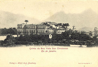 Museu Nacional O comerciante Elias Antônio Lopas começou, em 1803, a construir sua casa de campo em São Cristóvão (Quinta da Boa Vista), doando-a ao Príncipe Regente D. João, em 1808. O prédio passou por várias reformas de ampliação e embelezamento, até chegar às linhas arquitetônicas atuais. Em frente ao antigo Palácio Imperial foi colocado o Pórtico Monumental, vindo da Inglaterra, presenteado a D. João, cópia do existente no Palácio de Lorde Percy, Duque de Nothumberland. Em 1892 para ele se transferiu o Museu Nacional, hoje da UFRJ. (EB) |