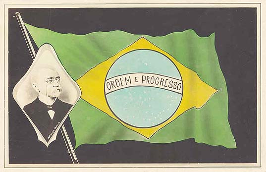 OBS: A bandeira republicana foi instituída durante o governo provisório chefiado por Manuel Deodoro da Fonseca, segundo o decreto número 4 de 1889. Na bandeira aqui apresentada aparece o Presidente da República Affonso Pena, que não tem nada haver com a criação da bandeira. Infelizmente, não tenho o cartão postal desta série com a figura do Marechal Deodoro. (BOD)
