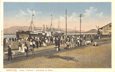 Santos era il principale porto d'entrata dato che era il porto di São Paulo. La cartolina raffigura l'arrivo del "Nord America" della compagnia "La Veloce".