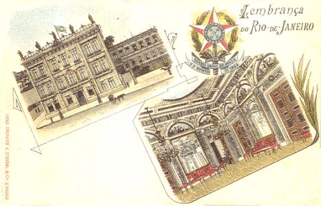 As gravuras mostram aspectos do Palácio do Catete, hoje Museu da República, quando sede do Governo Federal, a partir de 1897. O palácio, construído pelo Conde de Nova Friburgo, para sua residência, ainda ostenta as estátuas originais, ora substituídas pelas águias. Em detalhe o salão de recepções. (EB) |
