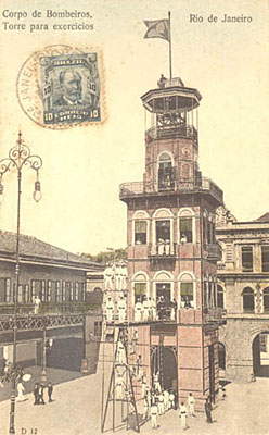 DE BOMBEIROS Projeto de Francisco Marcelino de Souza Aguiar, foi inaugurado na praça da República em 23 de maio de 1908, autor também do Palácio Monroe e da Biblioteca Nacional. Para alcançar o cume da torre sobe-se 268 degraus. (Frid) |