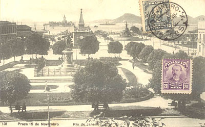 Podemos ver aqui uma rica imagem de um sítio histórico. Em primeiro plano o monumento ao general Osório, realizado pelo estatuário Rodolpho Bernardelli, foi inaugurado em 1894 e curiosamente é o único monumento do mundo onde um oficial da arma de cavalaria está sem botas, no entanto , não foi erro do estatuário pois, Osório contraiu feridas nas pernas e ficou impossibilitado de usá-las. Logo a seguir está o chafariz atribuído ao mestre Valentim, inaugurado em 1789, mais a direita vislumbra-se o chafariz feito na França , mas estava na Áustria quando em 1878, D. Pedro II o comprou e foi colocado neste local onde permaneceu até a década de 60, quando no governo de Carlos Lacerda foi levado para praça da Bandeira e posteriormente, com o arrasamento do palácio Monroe, foi colocado no local que este ocupava. Mais ao fundo a ilha Fiscal. (Frid) |