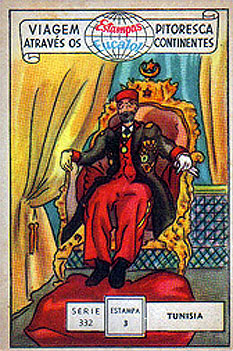 Tunísia, colônia francesa, tem um Bey como governador. Aqui está o Bey de Túnis no seu trono. O representante da França no domínio da colônia chama-se Residente Geral. Tunisia,